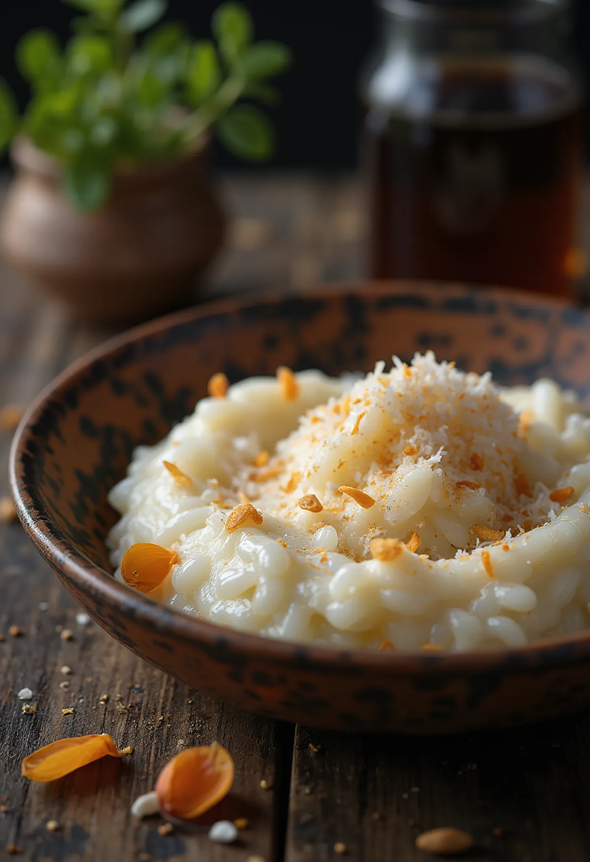 פירני הוא האריסטוקרט של פודינגי האורז ההודיים. בניגוד ל'קיר' (Kheer), שבו גרגירי האורז נשארים שלמים, כאן טוחנים את האורז גס, וכך מתקבל מרקם משיי, קרמי וכמעט פודינגי. באופן מסורתי מצננים אותו בקערות חימר לא מזוגגות, הסופגות את עודפי הלחות, וכך הקינוח הופך לסמיך ועשיר עוד יותר. גרסת הקוקוס היא טוויסט דרומי לקלאסיקה הצפונית הזו.