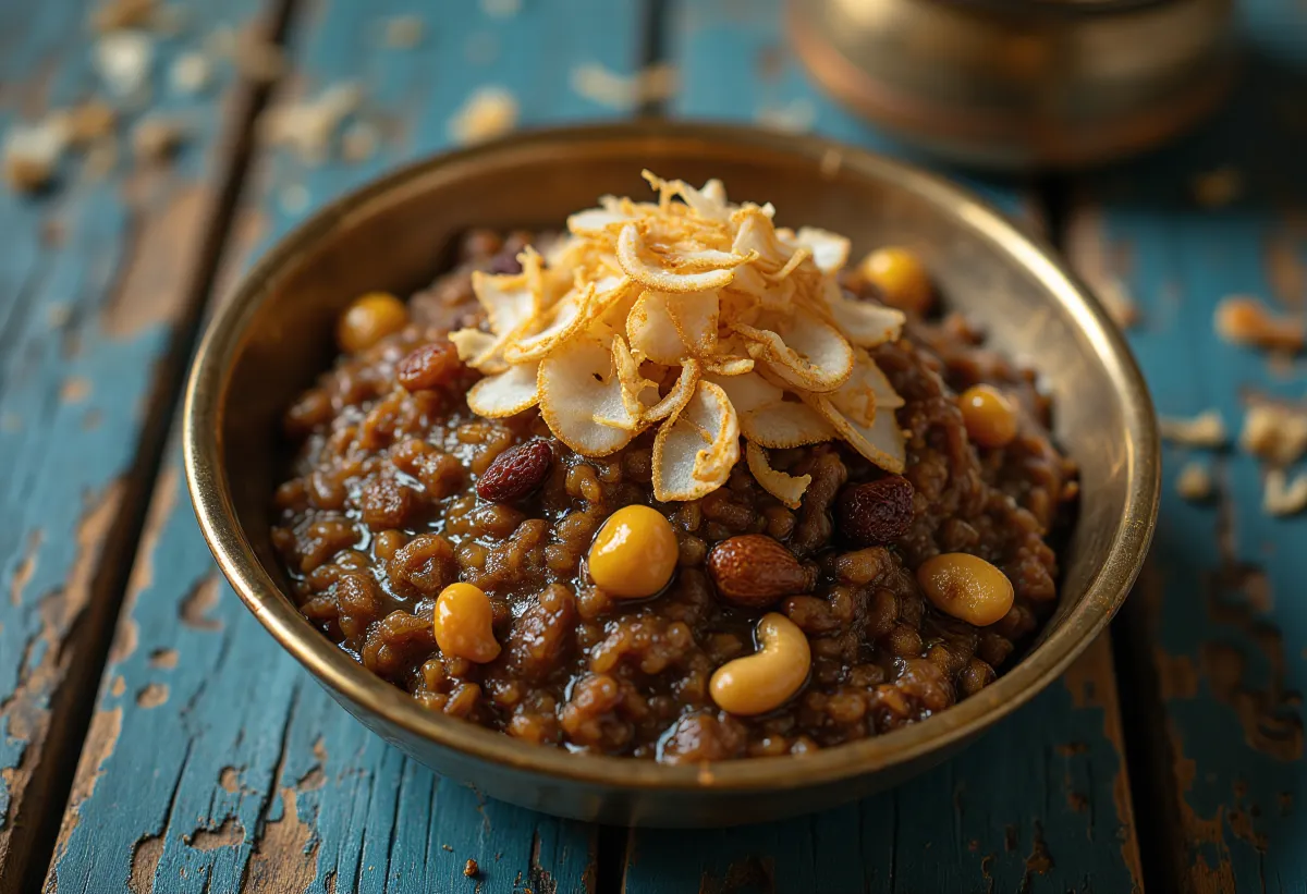 המאכל הקדוש של המקדשים (Kovil) בדרום הודו, שם המזון המוצע לאלים (prasadam) עשוי תמיד מחומרי הגלם הטהורים והעשירים ביותר. זה לא סתם פודינג אורז: שפע הגי (חמאה מזוקקת), הסוכר המתקרמל והאגוזים הקלויים מעניקים לו עולם טעמים מורכב, שהוא מתוק, מלוח ומתובל בו זמנית. המרקם שלו קרמי, כמעט נמס בפה.